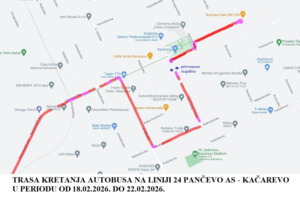 Izmena će trajati sve do nedelje 22.02.2026. do kraja dana i privremena trasa kretanja autobusa kroz Kačarevo biće: